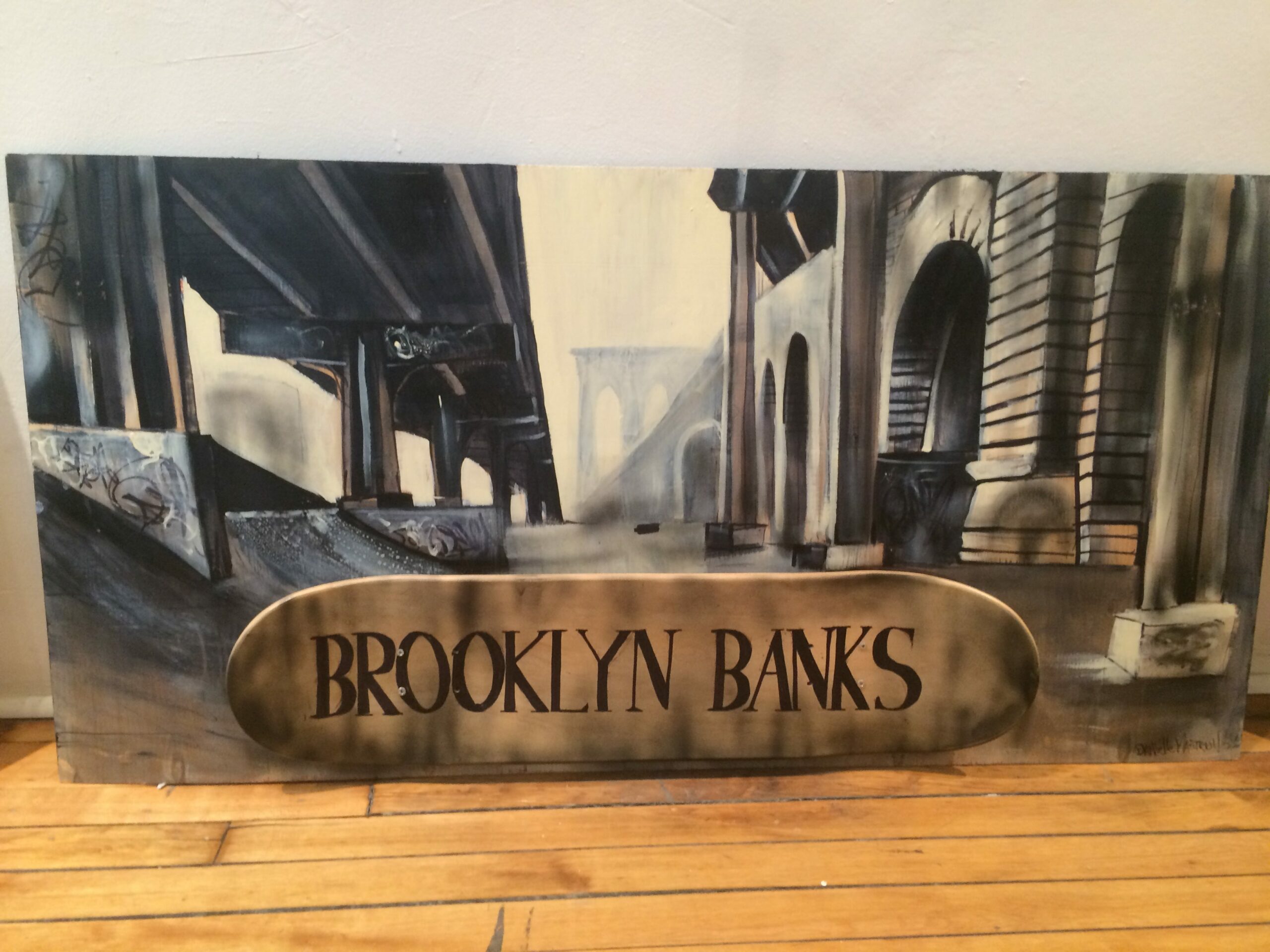 “Brooklyn Banks” by Danielle Mastrion, 24” x 36”, acryllic, skateboard art glued to particle board, 2015.