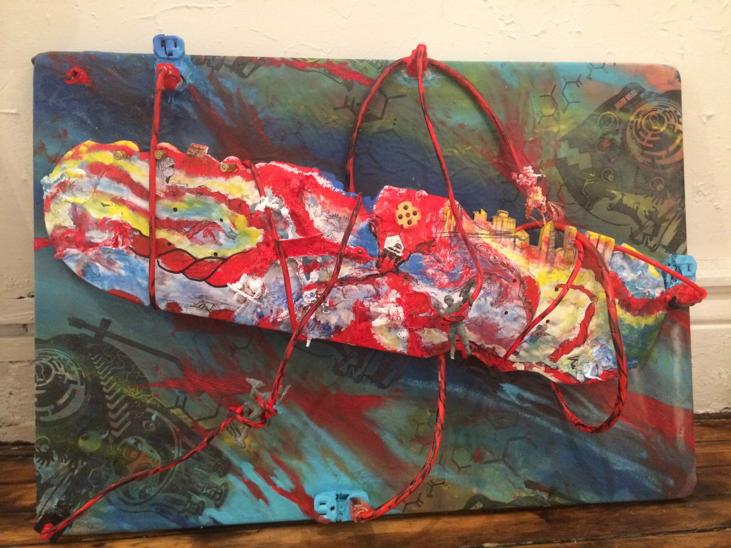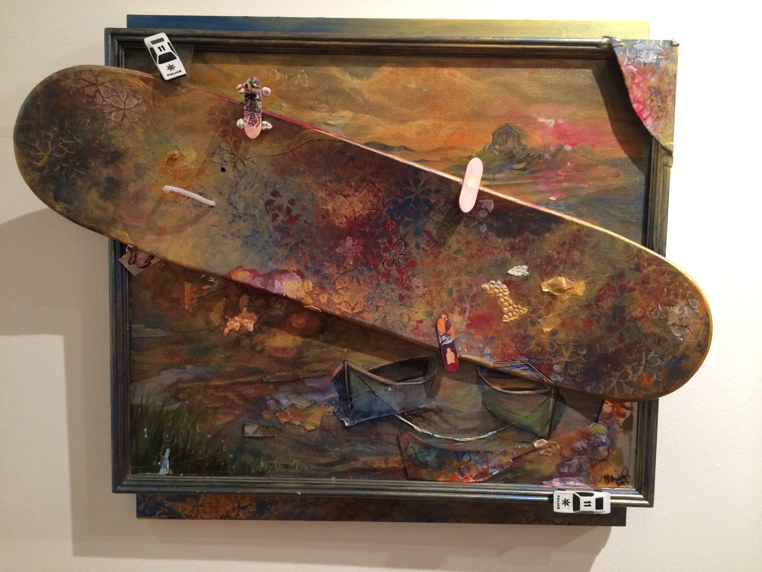 “Cali” by Marivel Mejia, 24” x 36”, acrylic, glass and minature toy pieces, skateboard mounted/removable, 2015.