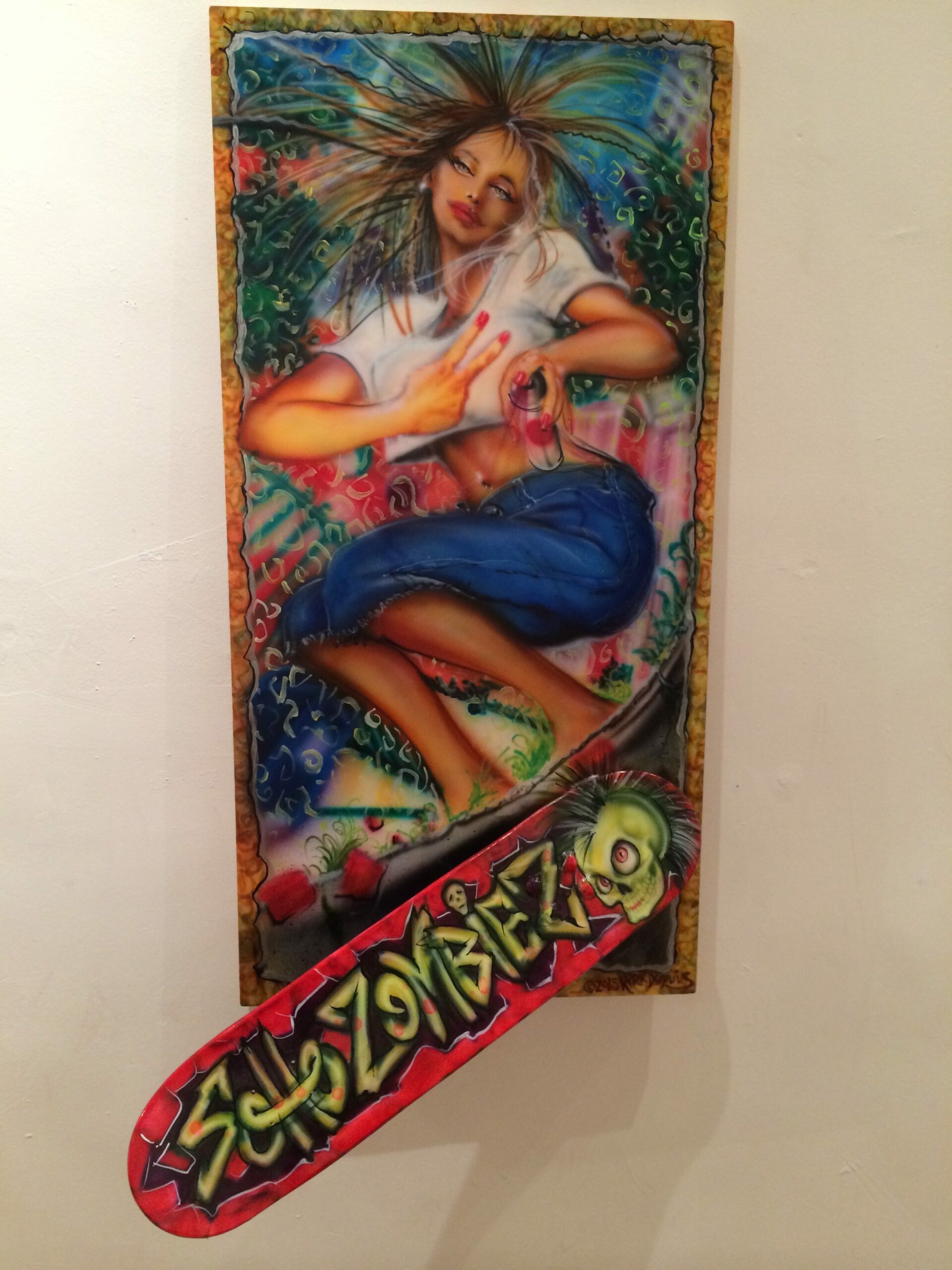 “MaryJane Wildstyle” by Kirkworx Dupuis, 24” X 48”, acrylic and airbrush catalyzed, skateboard mounted, 2015.