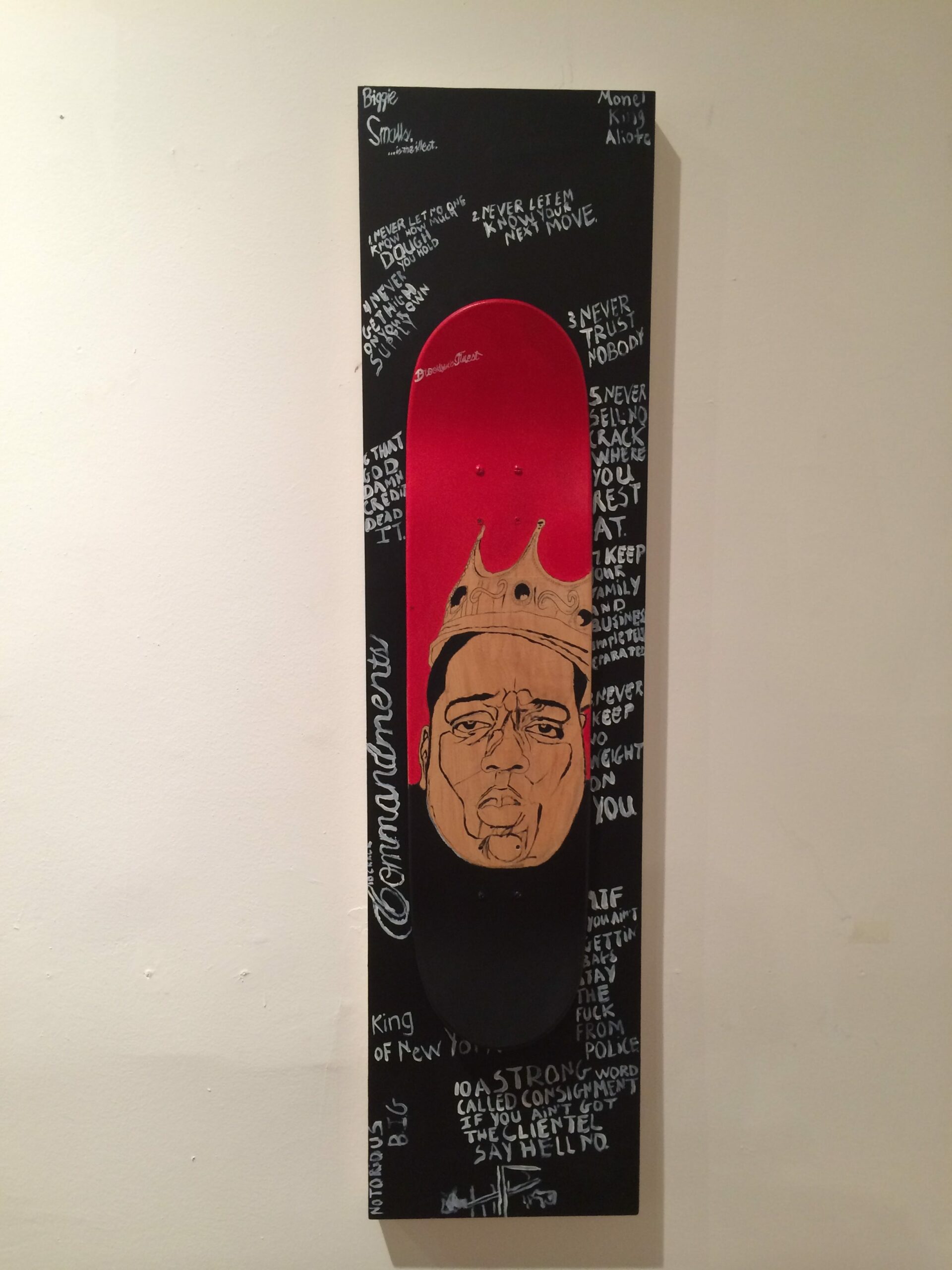 1. “Biggie” by Monel King Aliote, 12” x 48”, skateboard art mounted to wood, 2015