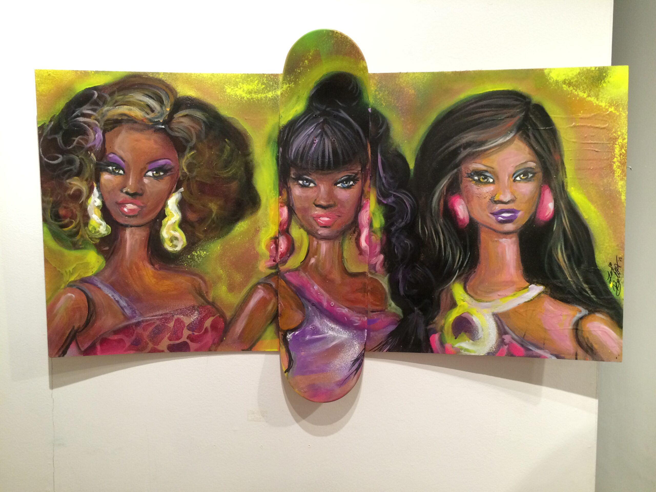 “Black Barbies” by Lexi Bella, 00” x 48” acryllic on particle board, skateboard art centered, 2015.