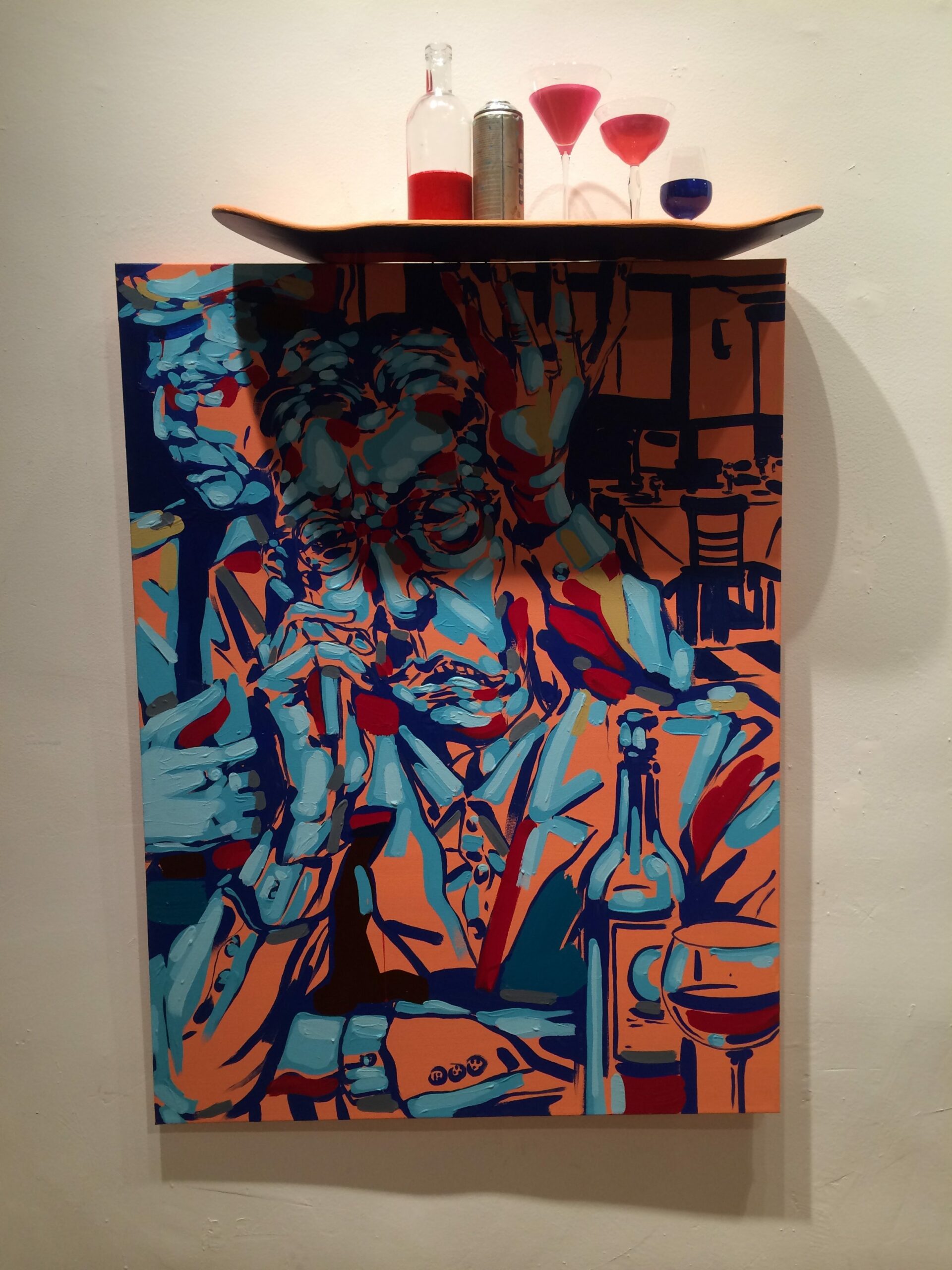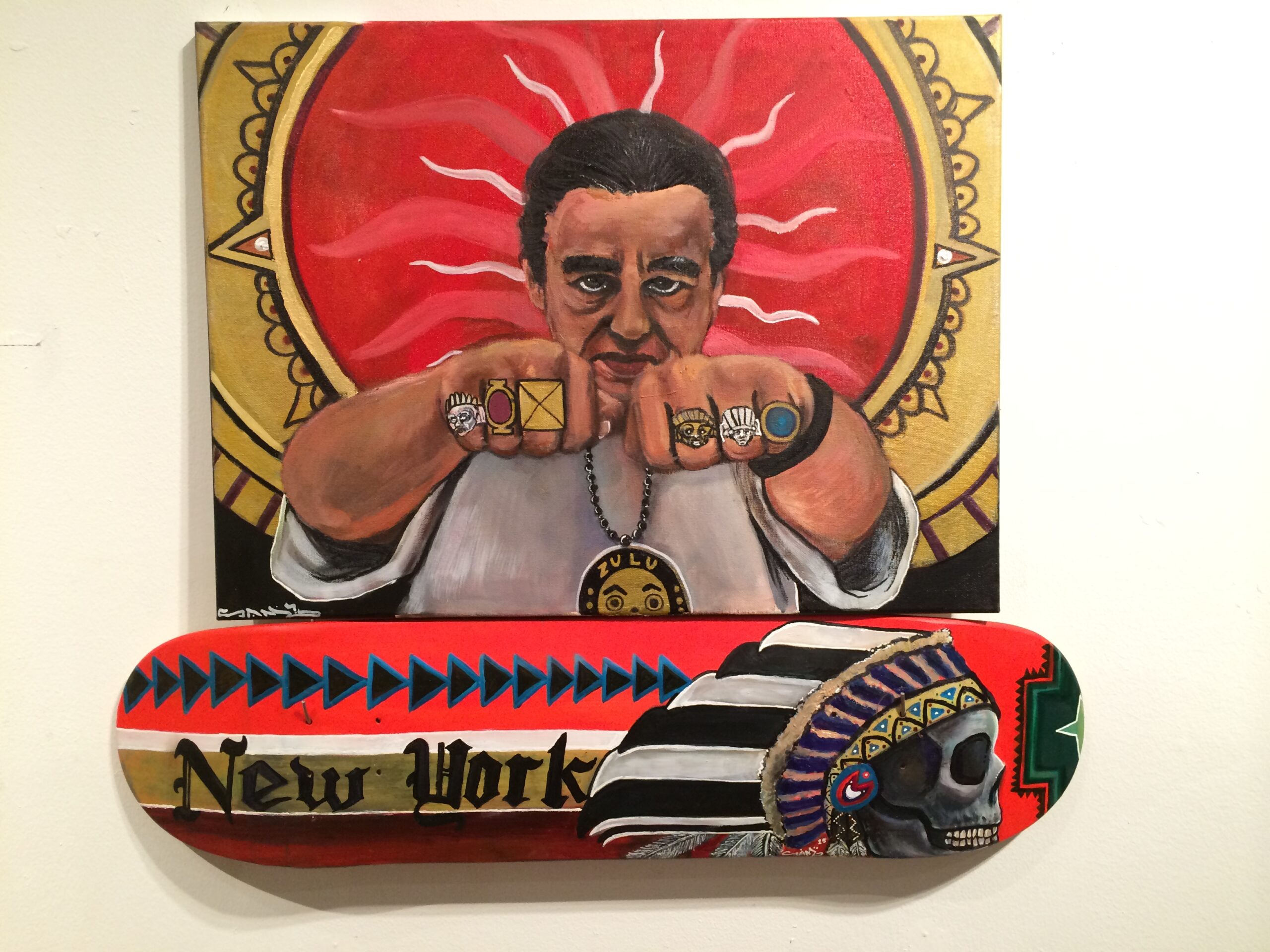 “Ernie Paniccioli” by Sam Jay, 18” x 24”, acrylic on canvas, skateboard art attached, 2015.