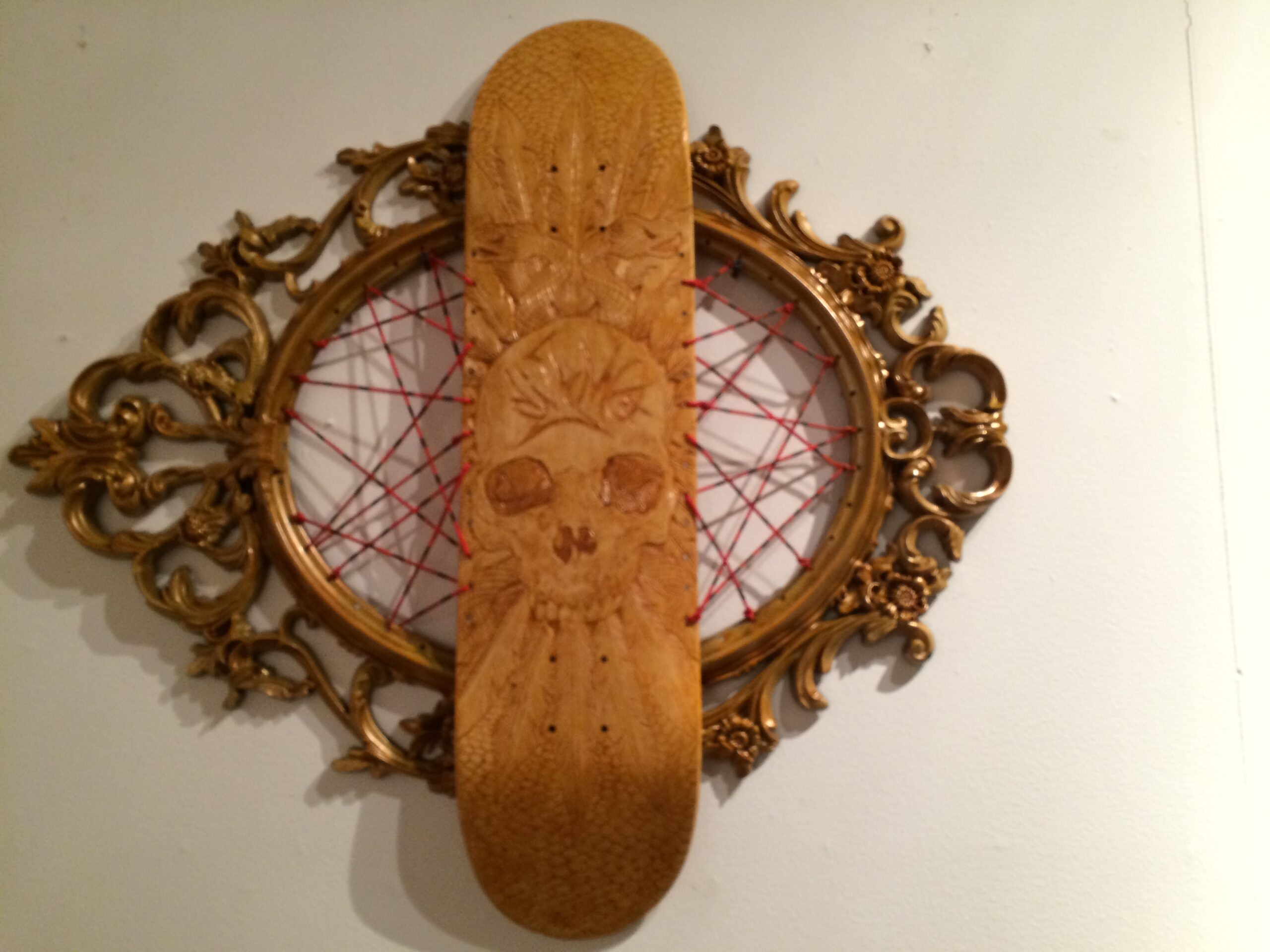 Untitled by Dizmology, hand carved skateboard with ornate frame, 2015