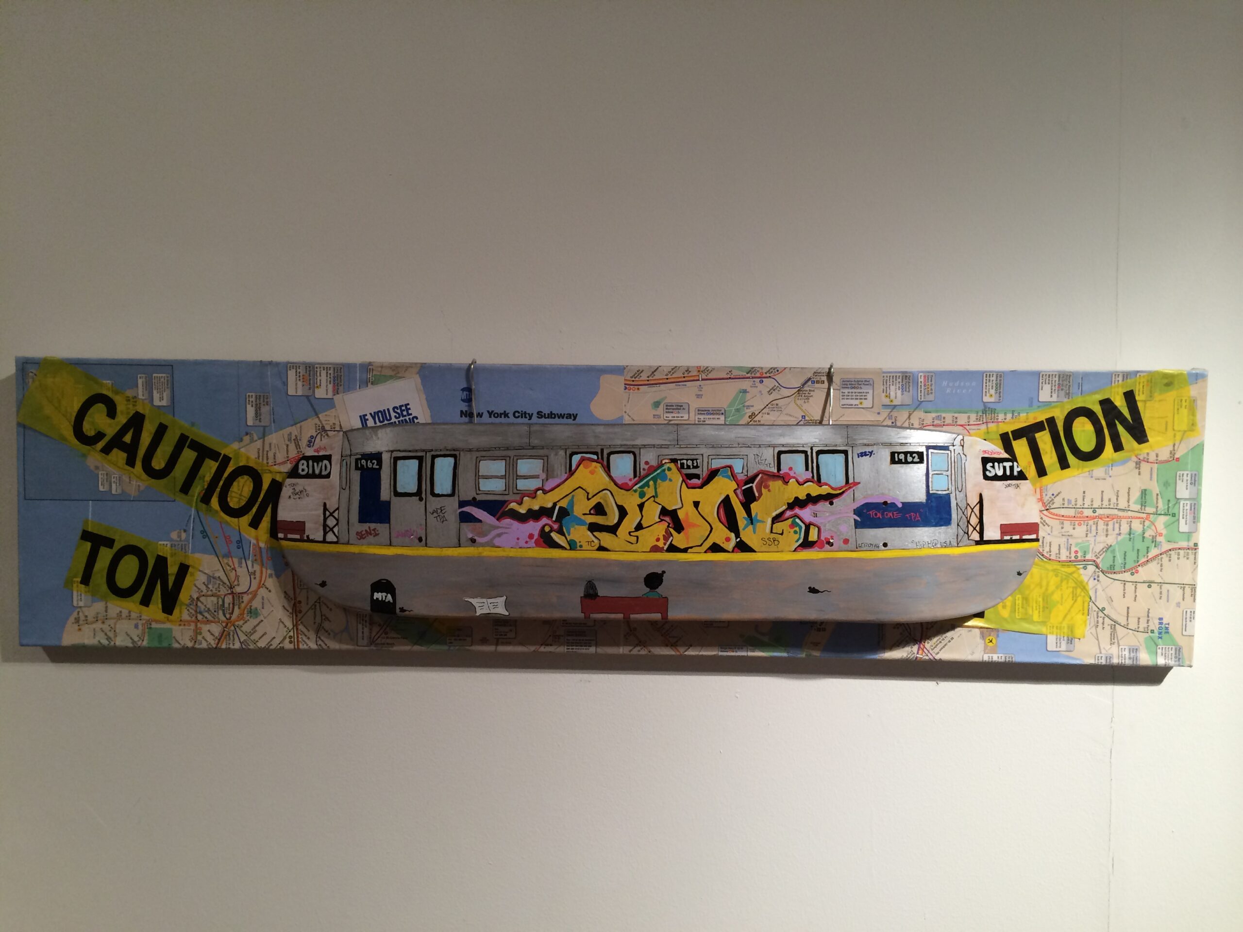 “Watch Your Step” by Ton, 12” x 48”, subway maps + removable skatetrain skateboard art, 2015.