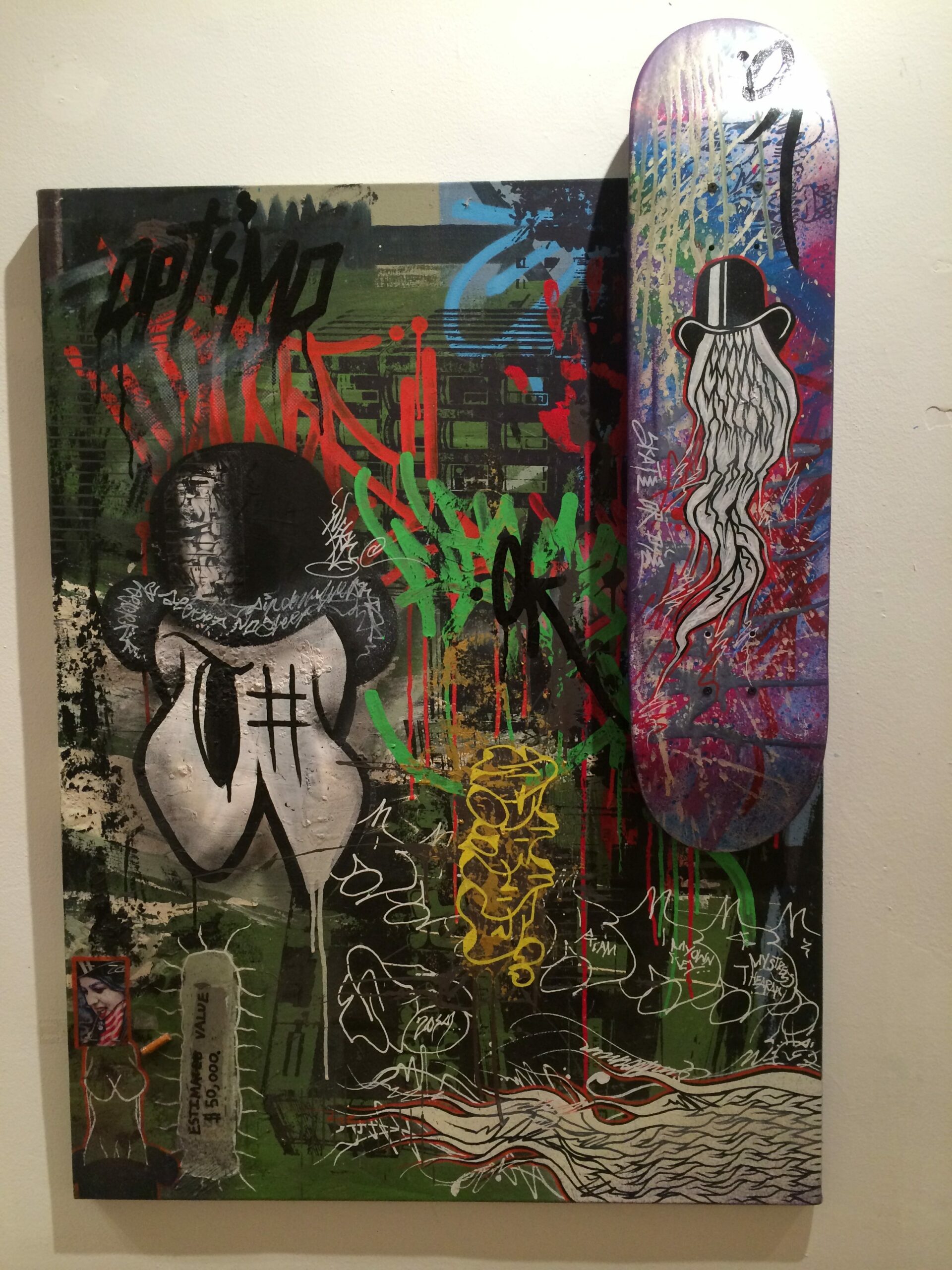 “Skate or Die” by Optimo, 30” x 40”, painting on canvas, skateboard deck mounted, 2015