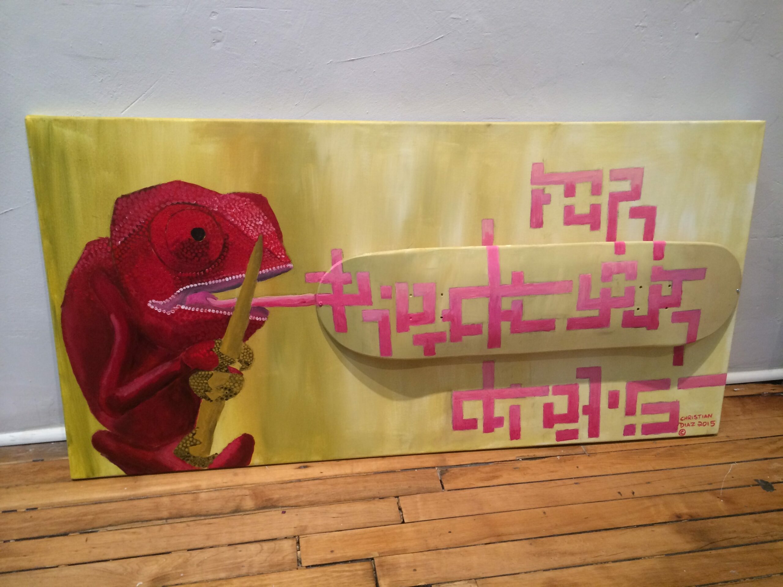 “Reach For Your Dreams” by Christian Diaz, 24” x 48”, acrylic on canvas, skateboard mounted/removable,
