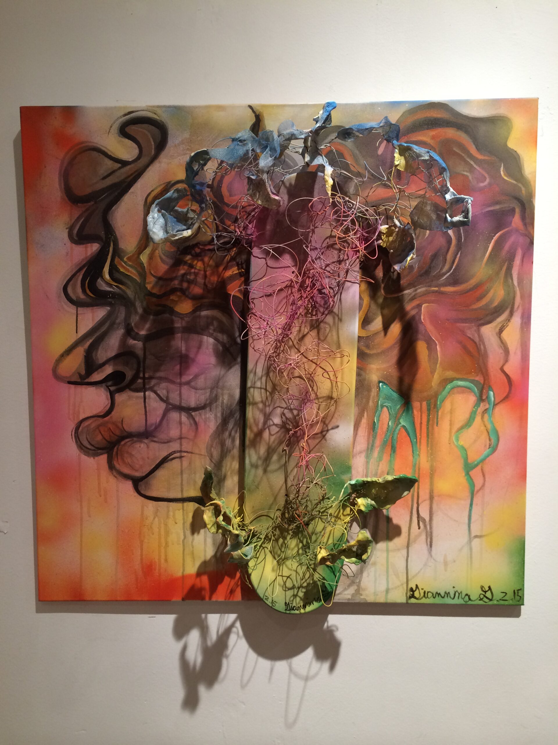 “Spring Is Coming” by Giannina Gutierriez, 36” x 36”, mixed media, skateboard mounted to canvas, 2015.