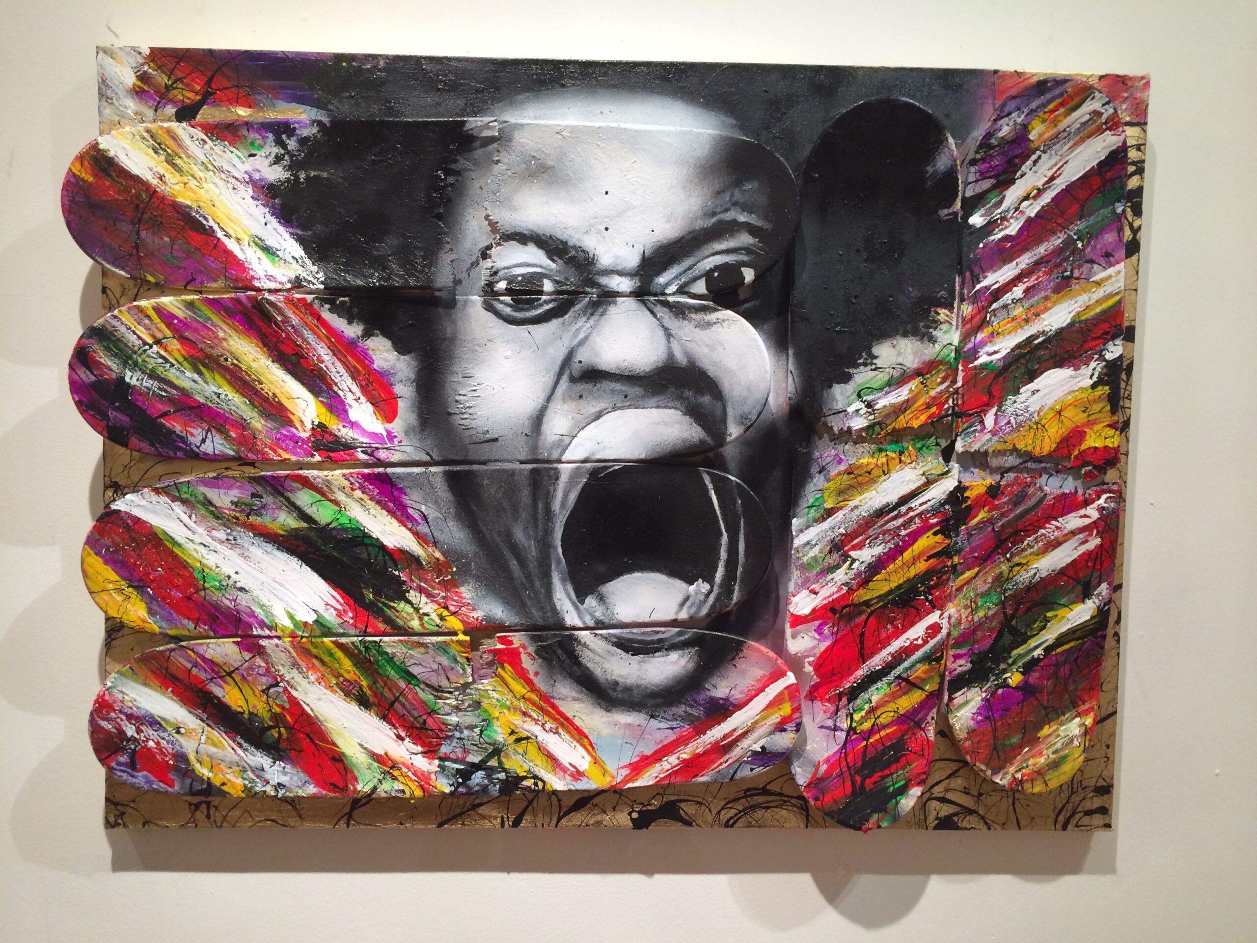 “Legends Never Die” by Savior ElMundo and N-Carlos Jay, 36” x 48” mixed media canvas with skateboards, 2015