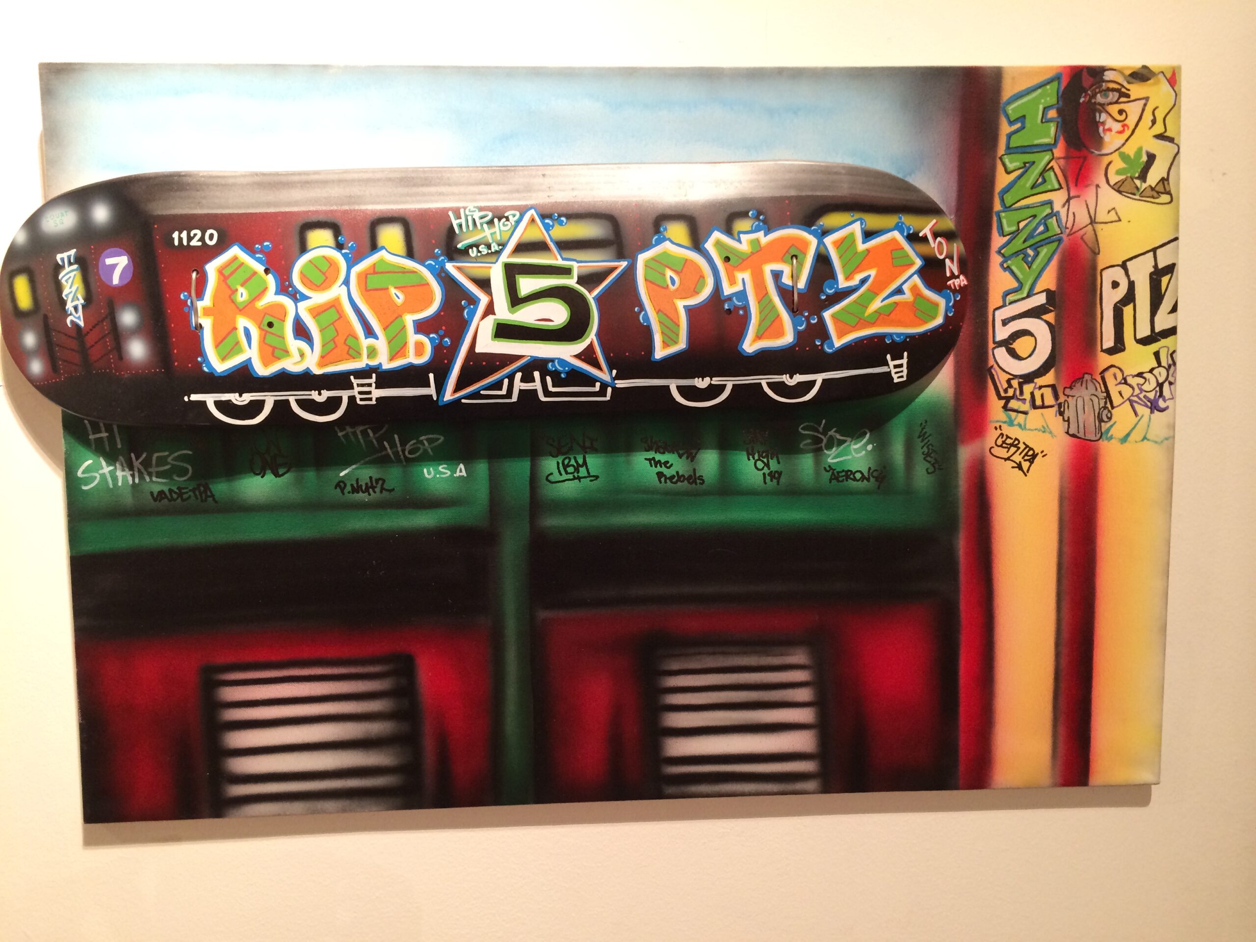 “RIP 5pointz” by Israel Garcia, 24” x 36”, airbrush, skateboard mounted and removable, 2015