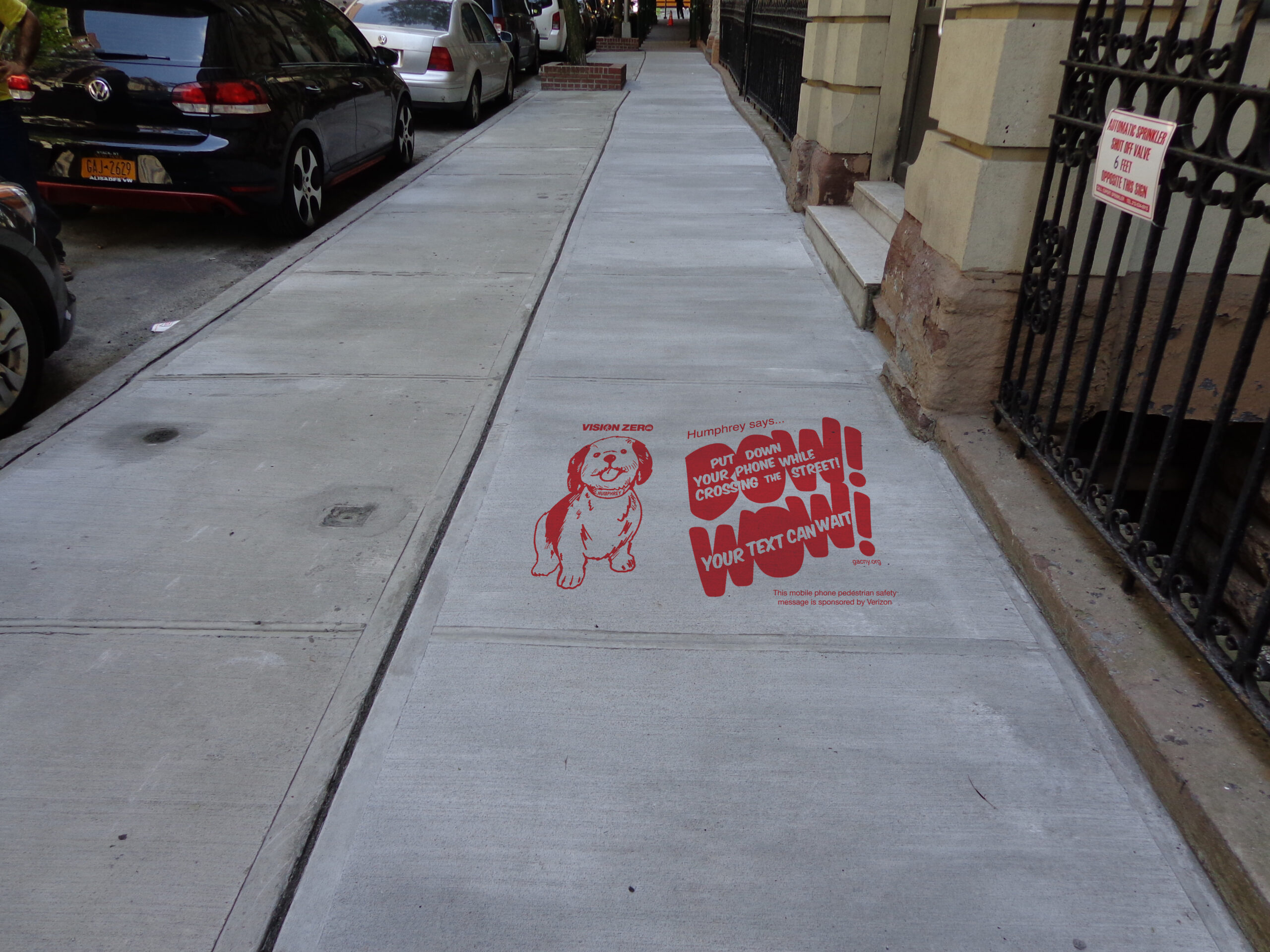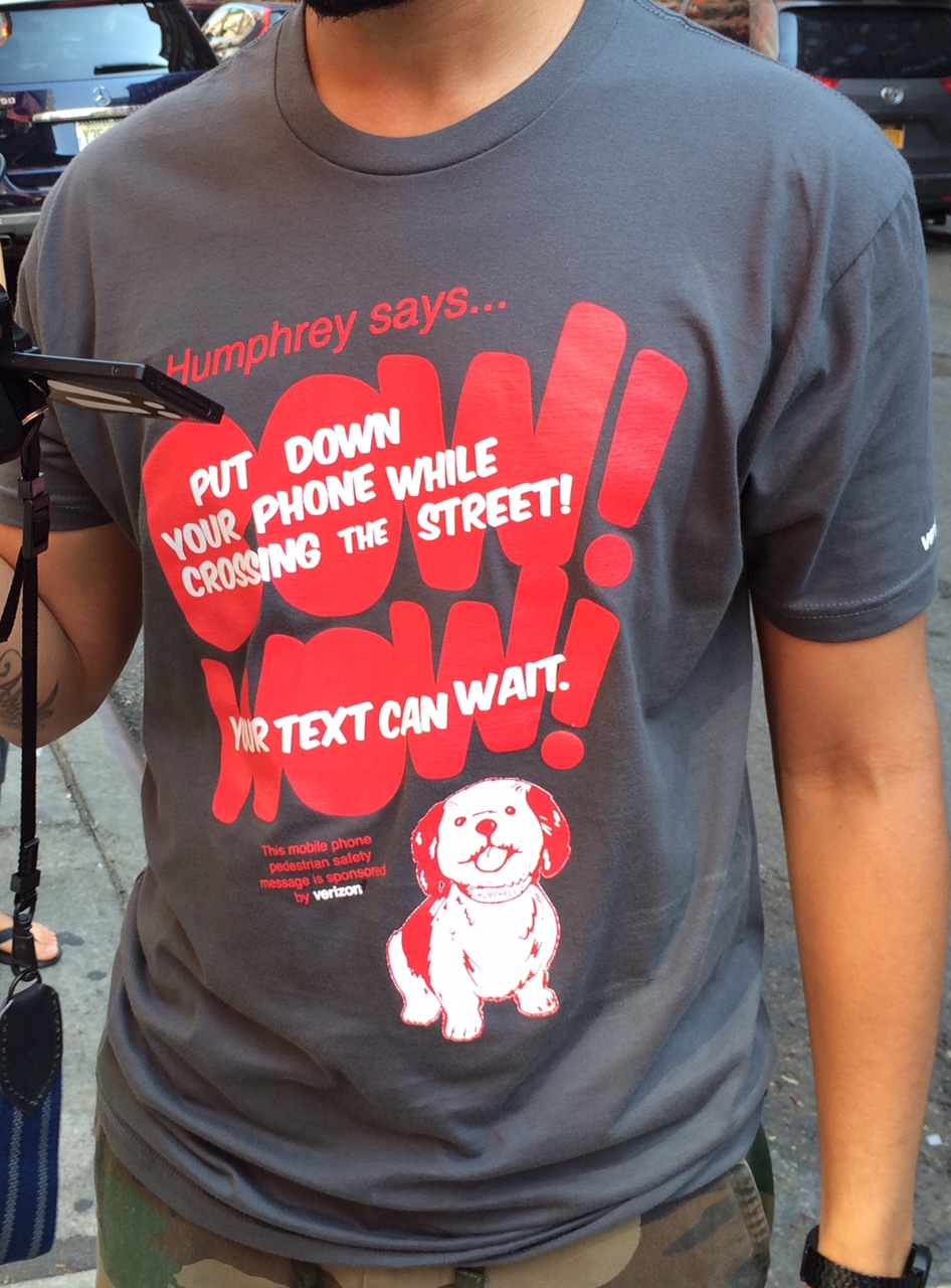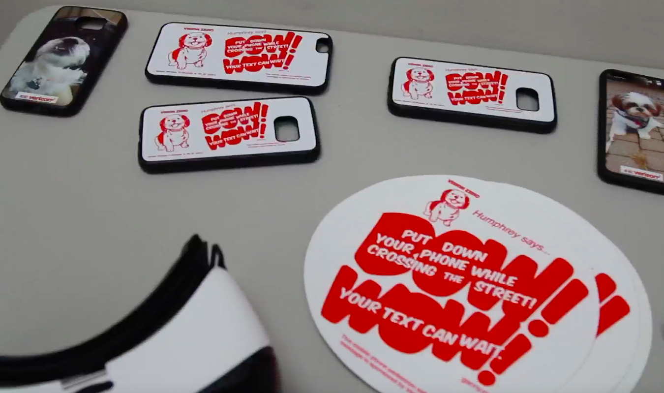 With the enthusiastic support of Chief Thomas Chan, a new cartoon illustration of Humphrey was deployed to addresses the dangers of distracted mobile phone use in and around traffic. A quick way stop distracted pedestrian mobile phone user was to put Humphrey’s life-saving warning on city sidewalks directly in view of their phone screens.